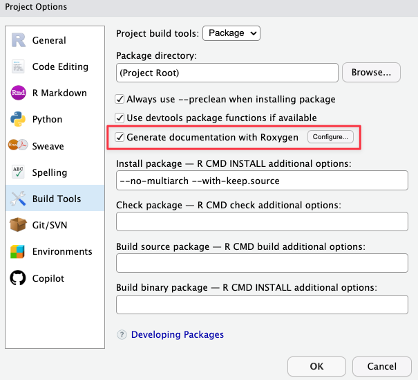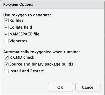 4.8.2 Under “Use roxygen to generate:” Check the following fields