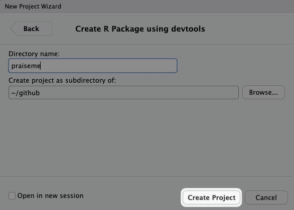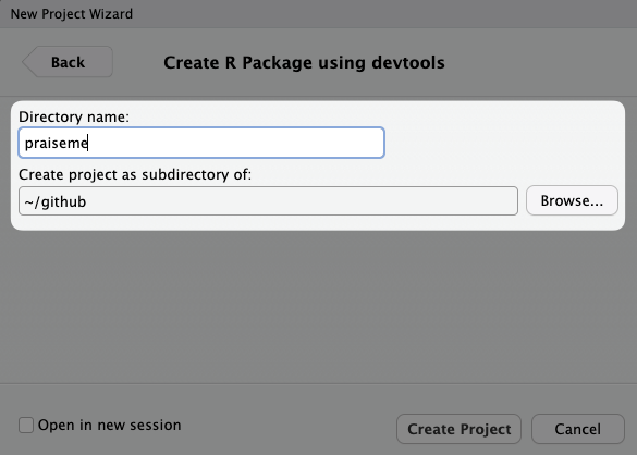 In “Directory Name” write the name of the package. In our case, “praiseme”