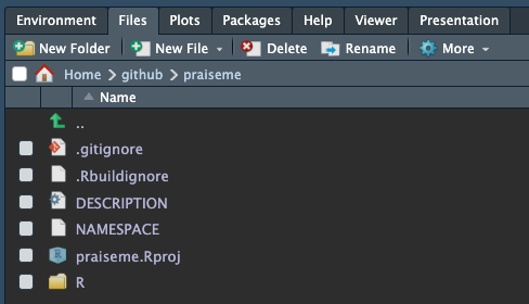 Which are specific RStudio files. As you get further along in the package building process, more files will be added to .Rbuildignore