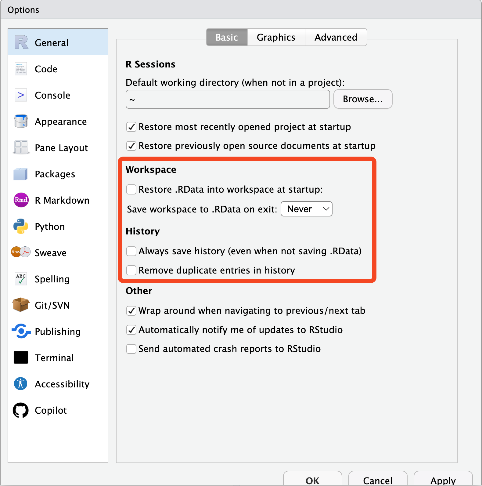This means that you won’t save the objects and other things that you create in your R session and reload them. This is important for two reasons